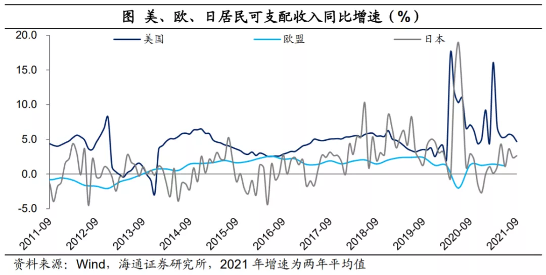 从相对经济表现的角度看,美国经济恢复也会好于欧洲、日本。08年金融危机爆发后,美国、欧盟、日本的居民收入增速都是大幅下滑的。但是去年疫情爆发后,美国居民收入不仅没有下降,反而上升。而欧洲、日本的居民收入增速与疫情之前相比,都有下台阶。收入和资产端的保障,美国经济恢复好于欧洲、日本。