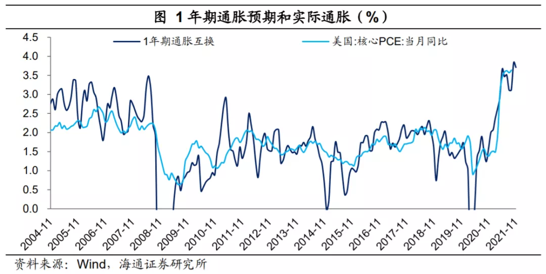 看完名义利率的决定机制,那么通胀预期又是由什么决定的呢?短期限的通胀预期,很大程度上受到当前通胀水平的影响。也就是说,如果现在的通胀水平较高,大家会预期1年后的通胀也会相对较高,如果现在的通胀水平较低,大家会预期1年后的通胀也会相对较低。通胀预期还会受到政策预期的影响,如果大家预期美联储未来会持续收紧货币政策,也会下调对通胀的预期;而如果大家预期美联储未来会继续宽松,通胀的预期也很难明显下降。此外,通胀预期还会受到主要大宗商品价格等因素的影响。