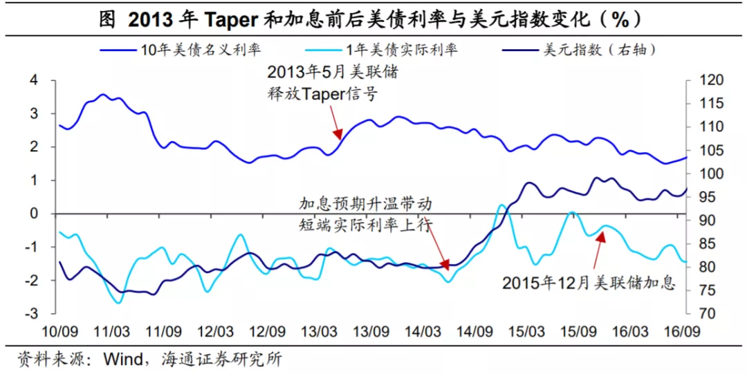 而在正式加息之前,市场会提前反应,加息预期发酵的过程就会推升美债利率和美元指数。例如,从2014年下半年开始,美元加息预期就开始发酵,通胀预期回落,1年期美债实际利率明显上行,推升美元指数大幅走高,主要新兴和发达货币都对美元贬值。而那一轮加息最终落地是在2015年底。