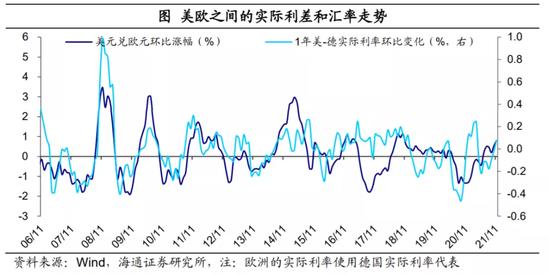 所以从实证角度看,我们发现,美元对欧元的汇率和美欧之间的实际利差有较高的正相关性,当美欧实际利差走高时,意味着投资美元资产获得的实际回报更高,资金从欧元流向美元,美元升值、欧元贬值;当美欧实际利差走低时,意味着投资欧元资产获得的实际回报相对走高,资金从美元流向欧元,美元贬值、欧元升值。类似的道理,美、英之间的汇率和二者之间的实际利差也有较高的相关性。所以不管是从理论还是实证角度看,实际利率对汇率的走势更为关键。