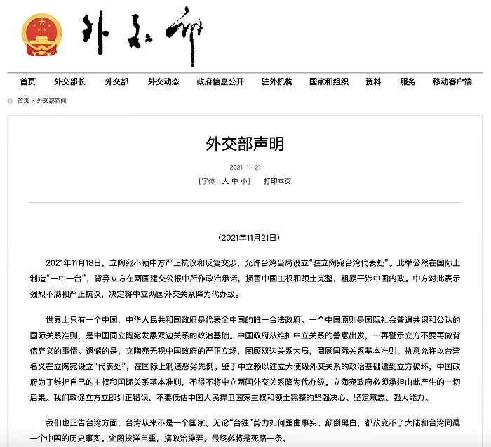 外交部11月21日发表声明,针对立陶宛不顾中方严正抗议和反复交涉,允许台湾当局设立“驻立陶宛台湾代表处”一事,中方表示强烈不满和严正抗议,决定将中立两国外交关系降为代办级。