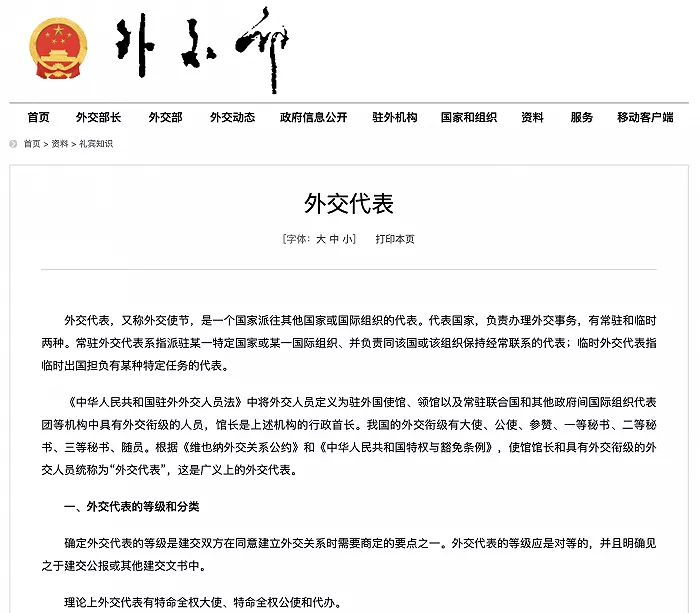 据外交部网站“礼宾知识”介绍,外交代表,又称外交使节,是一个国家派往其他国家或国际组织的代表。代表国家,负责办理外交事务,有常驻和临时两种。常驻外交代表系指派驻某一特定国家或某一国际组织、并负责同该国或该组织保持经常联系的代表;临时外交代表指临时出国担负有某种特定任务的代表。