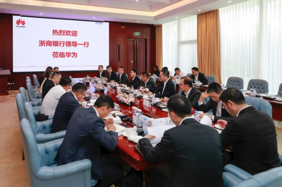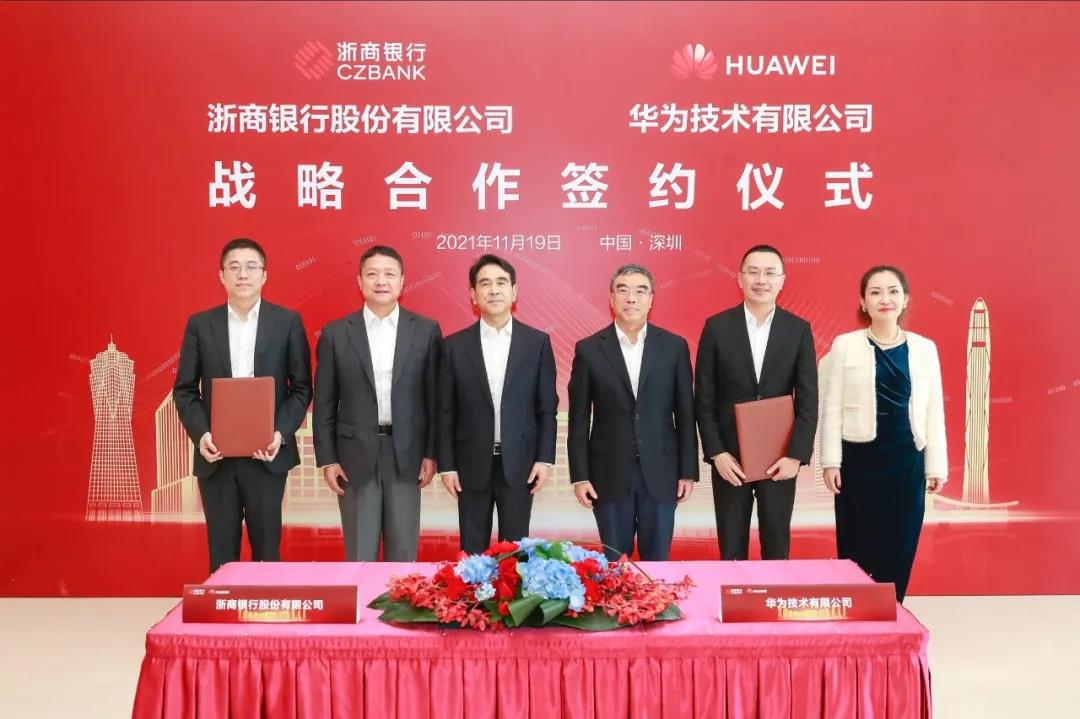 11月19日,浙商银行股份有限公司(以下简称“浙商银行”)与华为技术有限公司(以下简称“华为”)在深圳签署战略合作协议。浙商银行董事长沈仁康、行长张荣森、副行长景峰,华为公司董事长梁华、华为浙江总经理赵蕊、华为企业BG CFO王永刚等参加了签约仪式和会谈。