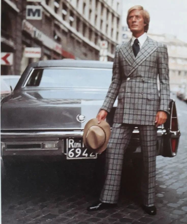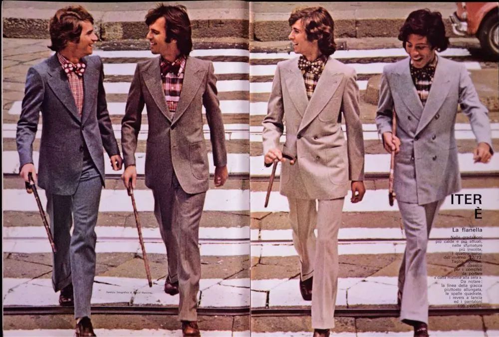 1968年,意大利品牌杰尼亚(Ermenegildo Zegna)还遵循着上世纪60年代的剪裁比例,1972年就陡然转身一变,采用翘肩、大驳头、收身和裙摆,拜倒在Nutter的伟力之下。