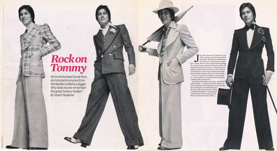 1969年,名不见经传的英国裁缝Tommy Nutter在几位演艺界好友的资助下创立了店铺“Nutters of Savile Row”,打破了这条历史悠久的英国裁缝街上一个多世纪未变的格局。店内装修极端“新潮”,埃及废墟壁画、五颜六色的鸵鸟羽毛和挂在门口代替铃铛的香槟空瓶都是老裁缝们难以想象的风格。