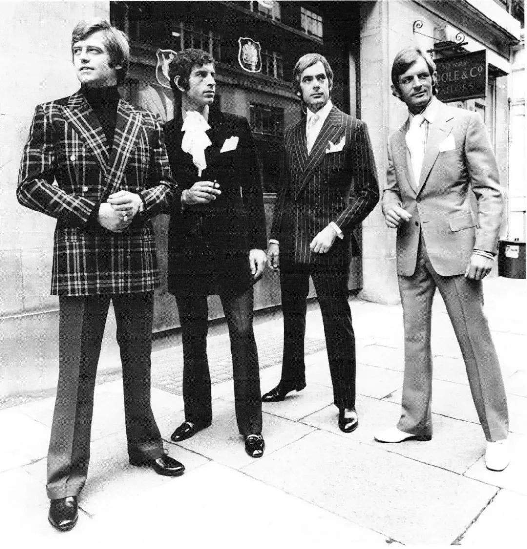 直到上世纪60年代后期,现代五大设计师或成名已久或声名鹊起,几个世代的设计师们携现代供应链之威,冲击着裁缝王朝摇摇欲坠的王座。而此时依然在世界男装尖端的伦敦,萨维尔街的传统工艺与卡纳比街沉浸于孔雀潮流的时髦青年们正针锋相对。