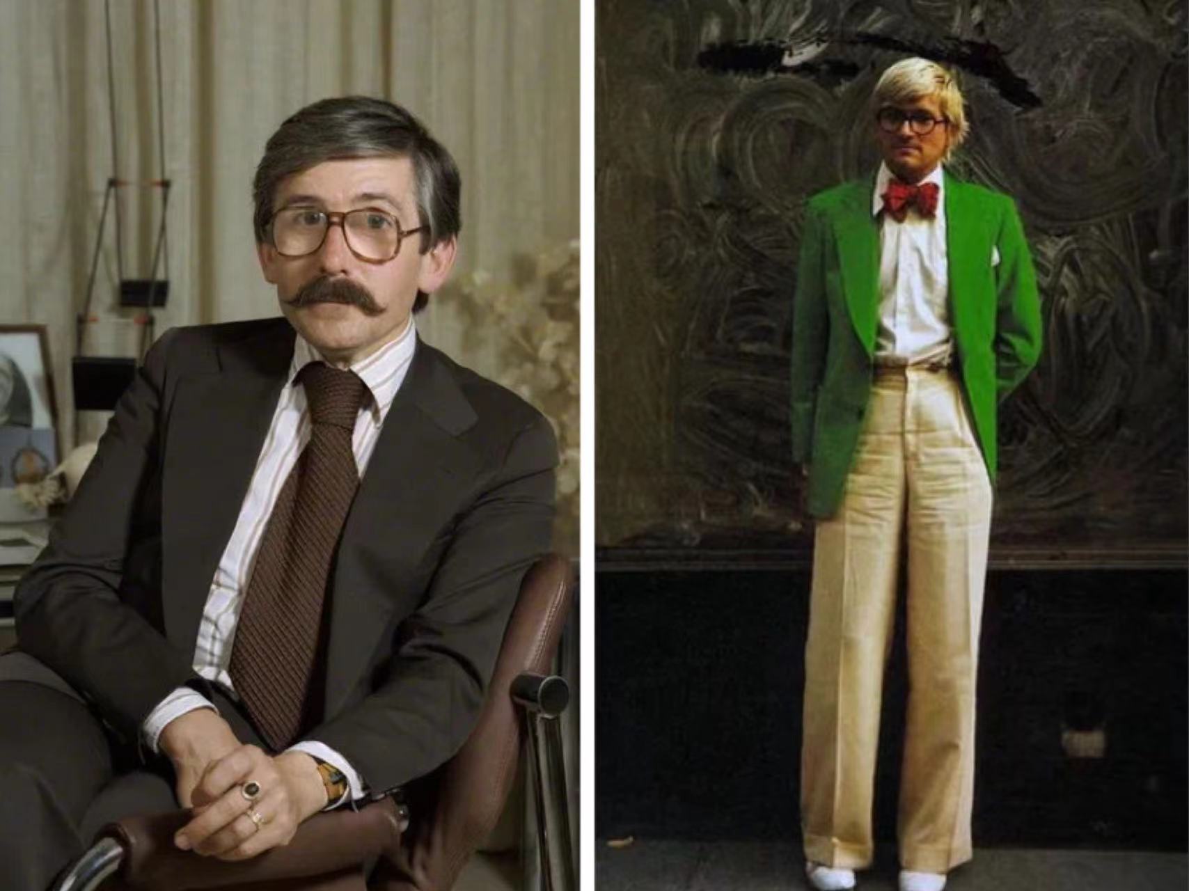 右:上世纪70年代,身着Nutter式剪裁的艺术家David Hockney
