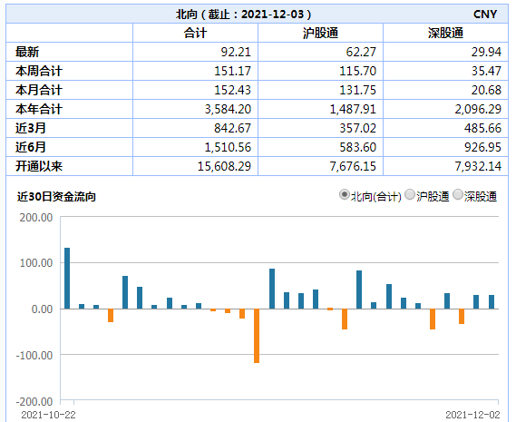 北向资金,今日合计净买入92.21亿元。其中,沪市净买入62.27亿元,深市净买入29.94亿元。