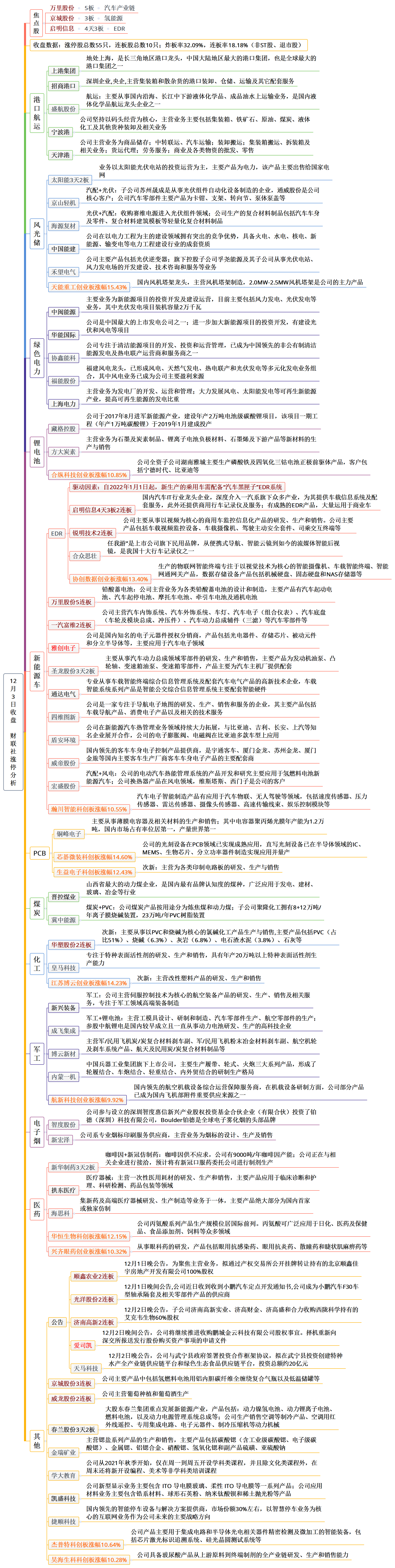 财联社12月3日讯,今日共55股涨停,26股封板未遂,封板率为68%;万里股份5连板,京城股份3连板,顺鑫农业、光洋股份、一汽富维、锐明技术、济南高新、威龙股份均2连板。盘面上,收涨个股2643只,收跌个股1716只,港口航运、绿色动力、煤炭等涨幅居前,烟草、教育、造纸等跌幅居前。