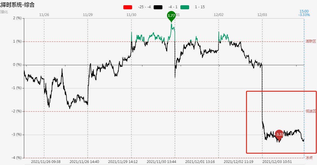 指标显示,市场短线情绪开盘大幅回落,全天均在低迷区下方震荡,主要受连板股及高位股影响。近几个交易日,市场风格有所切换,低位权重表现较好,可以关注是否会进入一个新周期。