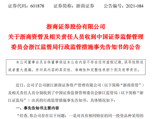 12月7日晚间,浙商证券公告了子公司浙商资管及相关责任人员收到的行政监管措施事先告知书的具体情况。