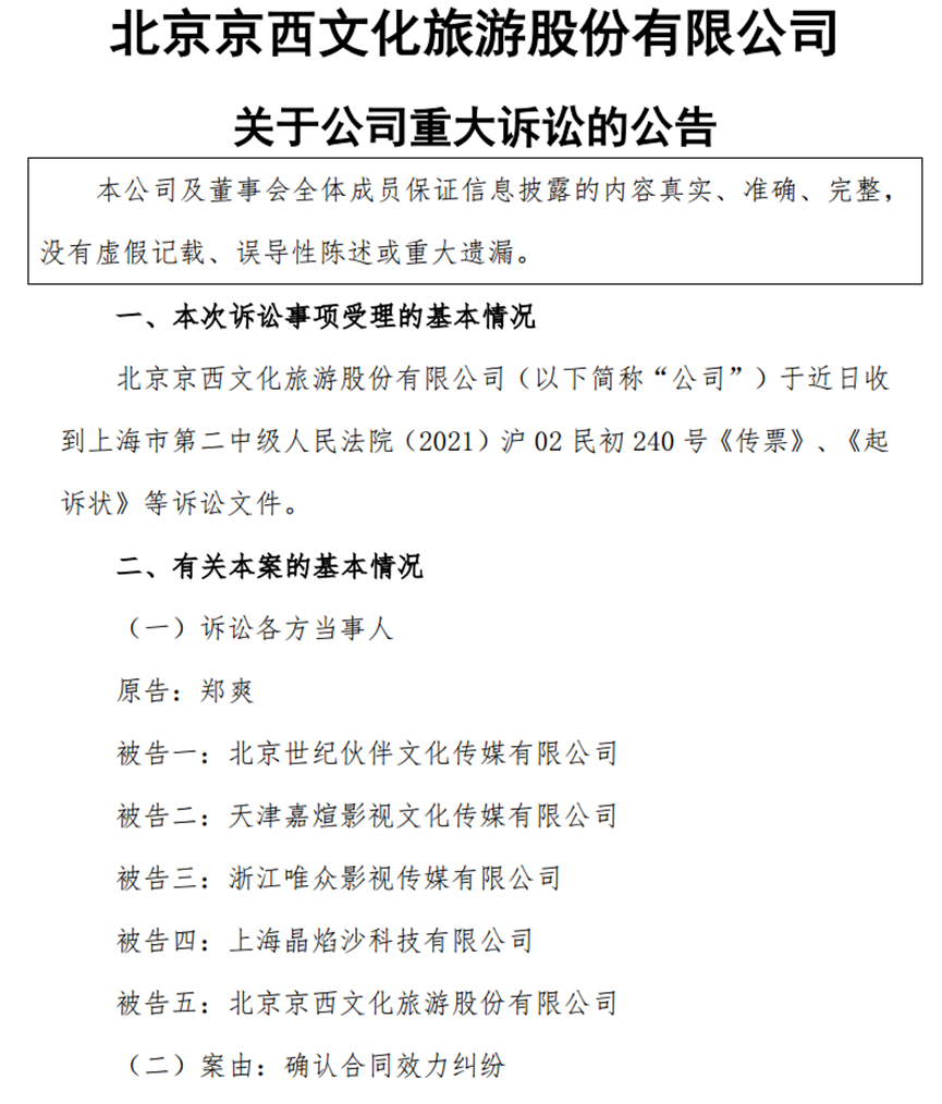 公告中显示,郑爽起诉的五被告分别为:北京世纪伙伴文化传媒有限公司(被告一)、天津嘉煊影视文化传媒有限公司(被告二)、浙江唯众影视传媒有限公司(被告三)、上海晶焰沙科技有限公司(被告四)、北京京西文化旅游股份有限公司(被告五)。