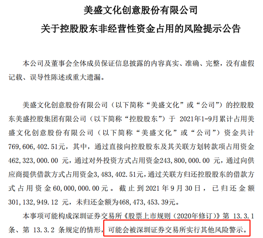 美盛文化表示,控股股东美盛控股集团有限公司于2021年1-9月累计占用公司资金共计7.7亿元,其中,通过直接向控股股东及其关联方划转款项占用资金4.62亿元,通过对外投资方式占用资金2.44亿元,通过向供应商提供借款方式占用资金348.34万元,通过关联方归还控股股东的借款方式占用资金6000万元。截止到2021年9月30日,已归还金额3.01亿元,未归还金额为4.68亿元。本事项可能被深交所实行其他风险警示。