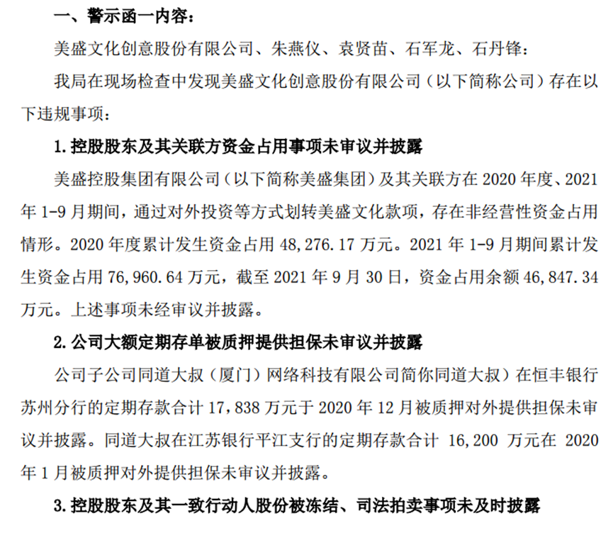 同日,美盛文化还收到了浙江证监局的警示函,其中提到了公司多项违规事项,包括控股股东及其关联方资金占用事项未审议并披露;公司大额定期存单被质押提供担保未审议并披露;控股股东及其一致行动人股份被冻结、司法拍卖事项未及时披露;公司内部控制存在重大缺陷等。