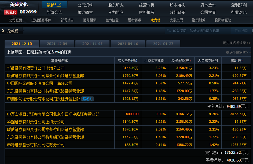 从昨日美盛文化的龙虎榜数据来看,买入方皆为游资席位,知名游资华鑫证券上海分公司以及银河证券绍兴营业部均上榜。