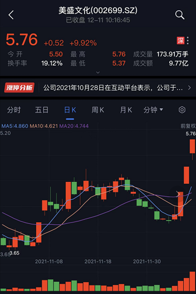 财联社12月11日讯,有着元宇宙概念的美盛文化近期强势三连板,不知不觉已成为了元宇宙概念的小龙头。