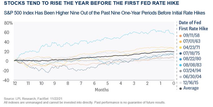 事实上,研究机构LPL周末公布的一组最新统计显示,尽管人们对美联储首次加息往往存在很多担忧,但标普500指数在过往9次美联储步入加息周期前的一年,依然能够平均录得上涨。换句话说,第一次加息可能意味着经济在当时依然具有活力,还存在上行动能,而年内迄今美股的强势表现似乎也印证了这一点。