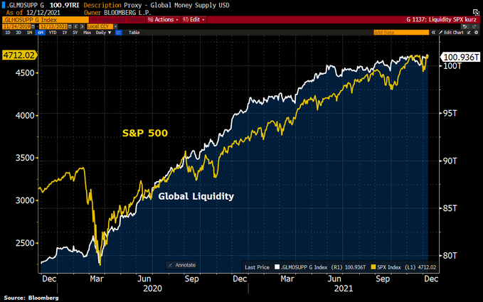 策略师Holger Zschaepitz指出,下面这张图表显示了为什么投资者不应忽视央行政策的转变:标普500指数今年的连创纪录,几乎与全球流动性的加速膨胀同步。而如果各国央行开始逐渐拧紧水龙头,情况又会如何呢?