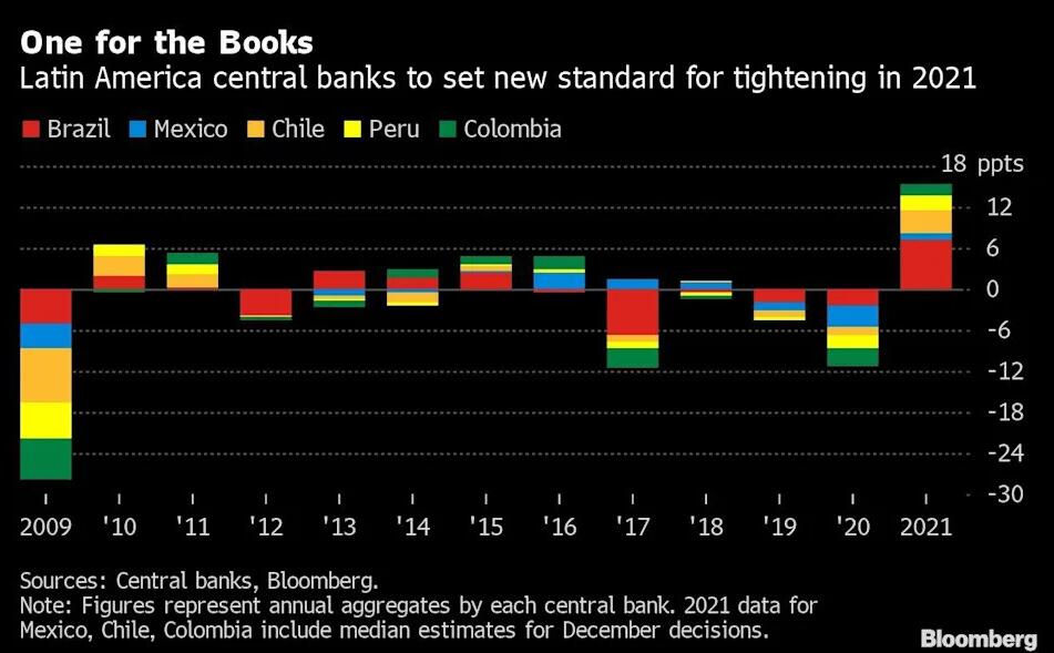 彭博经济首席新兴市场经济学家Ziad Daoud表示,“全球通胀上升、大宗商品价格上涨和货币走软,已经使不少新兴市场今年的利率走势同步。美国的紧缩货币政策更可能会成为推动明年加息的又一股全球力量。”