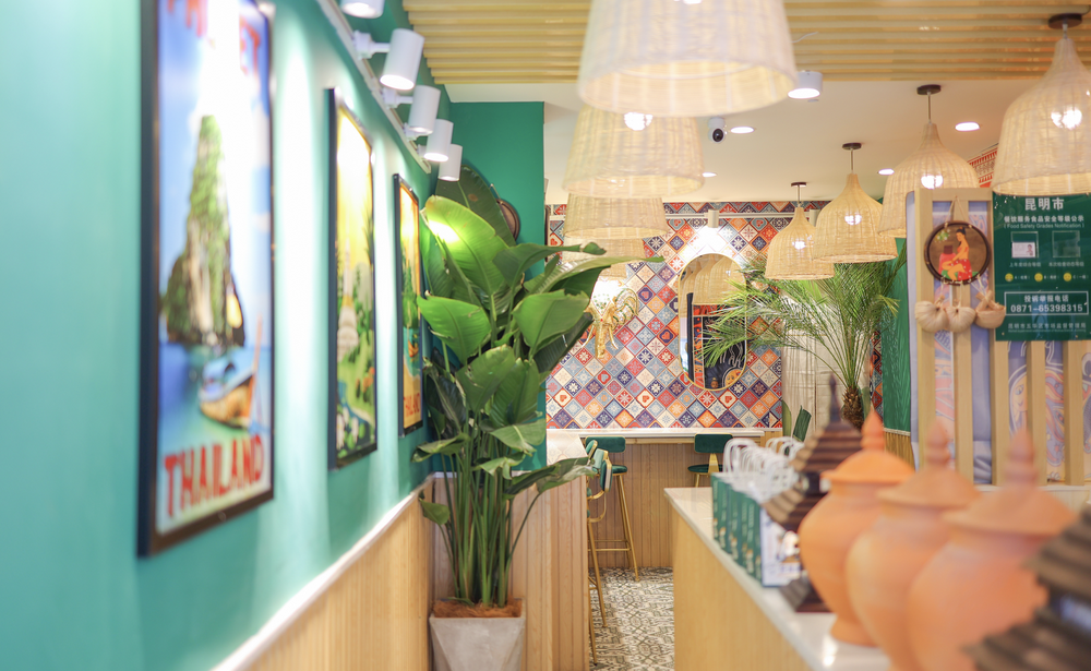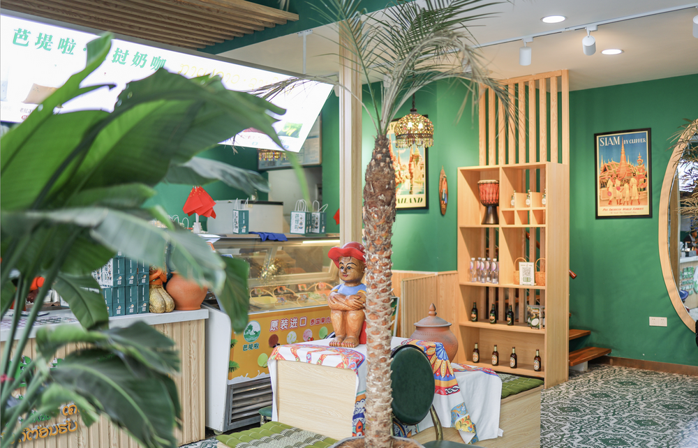 第二是门店空间。以芭堤啦为例,其门店中,棕榈树、芭蕉叶配上沙滩躺椅,以及各种东南亚纹饰、摆件,再加上穿着东南亚民族服饰的调茶师,时不时来一句“nīn dǐ dòu hāb”(老挝语“欢迎光临”的意思),给消费者制造出“一秒穿越东南亚”“假装在度假”的沉浸式体验。