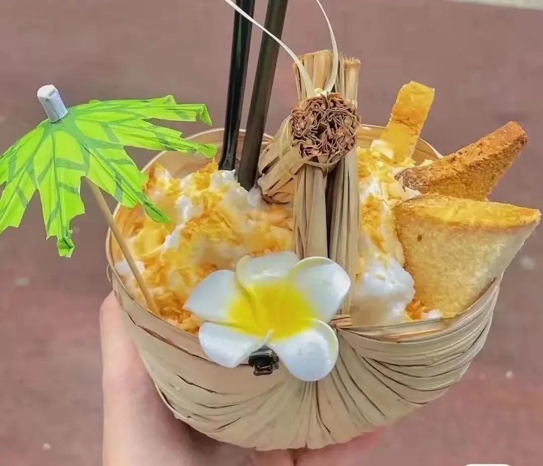 第一是独特的包装。袋装奶茶用透明塑料袋扎上小皮筋,再加上带异域图案的包装纸袋,晒在朋友圈十分吸睛。比如,流量款产品“椰子冰沙”,以藤编小篮子,加上冰淇淋、东南亚的代表性鸡蛋花装饰,颜值出众,随手一拍就是小红书硬照。