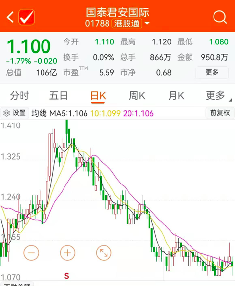 国泰君安国际今日报收1.1港元,总市值为106亿港元,今年来出现了一路下行的走势。2010年上市后,曾有过5.33港元的历史高点。