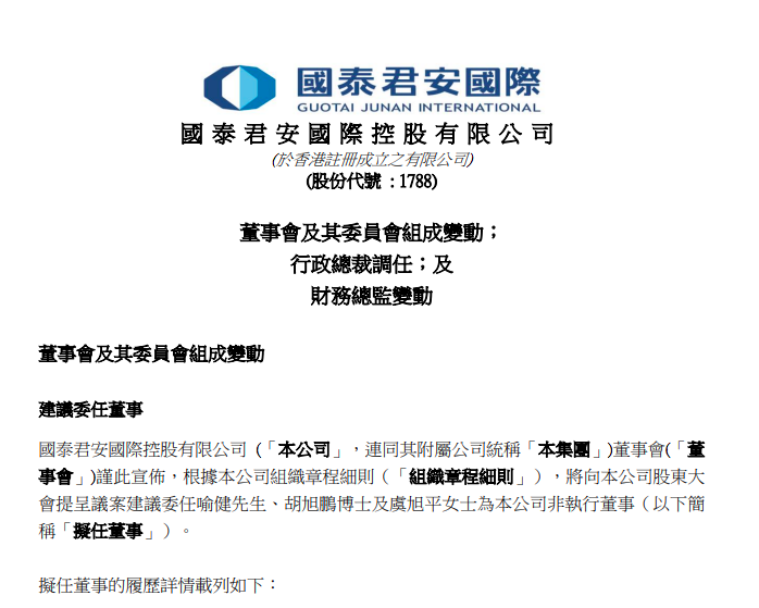 国泰君安国际的董事会成员与财务总监也产生了变动。根据国君国际港交所公告,由于集团工作安排,李光杰将不再担任财务总监一职。董事会亦同时宣布,敖奇顺获委任为集团新的财务总监。