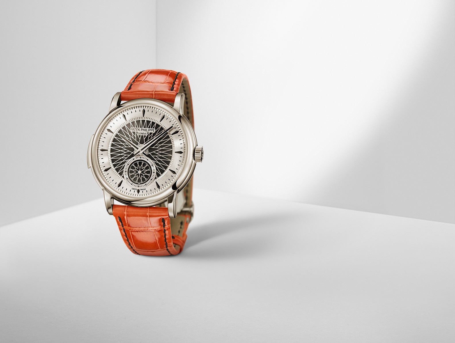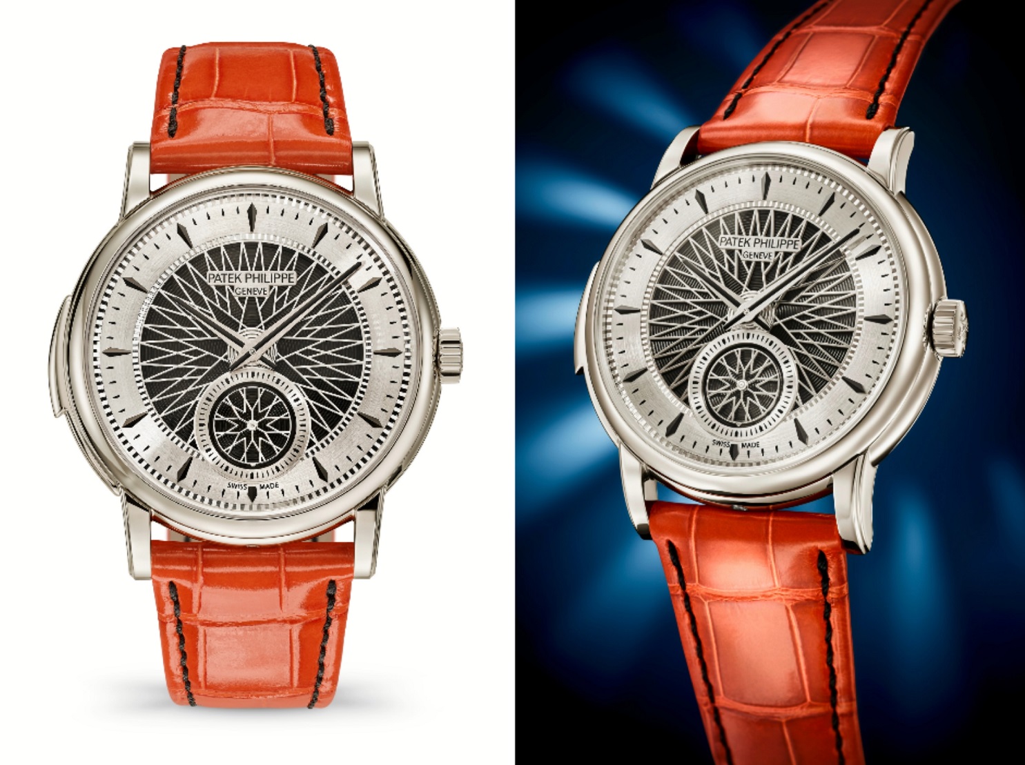 透过蓝宝石水晶透盖,可欣赏三问报时装置的音锤和传统音簧,领略形状似音叉的音杆,以及fortissimo扩音系统中与音杆连接的透明振荡晶片。离心调速器负责调节报时节拍,上面饰有镂空Calatrava十字星图案。此外,这款时计还配备百达翡丽“先进技术研究”系列于2006年推出的Silinvar材质Gyromax摆轮游丝,以及饰有日内瓦条纹的大型夹板,其边缘经倒角和抛光处理。铂金迷你自动盘饰有与表盘风格一致的图案。这种激光纹理图案表面能吸收光线,令某些部分呈现黑色。这款限量版腕表配有橙色鳄鱼皮表带,点缀对比鲜明的黑色缝线,搭配铂金折叠式表扣。