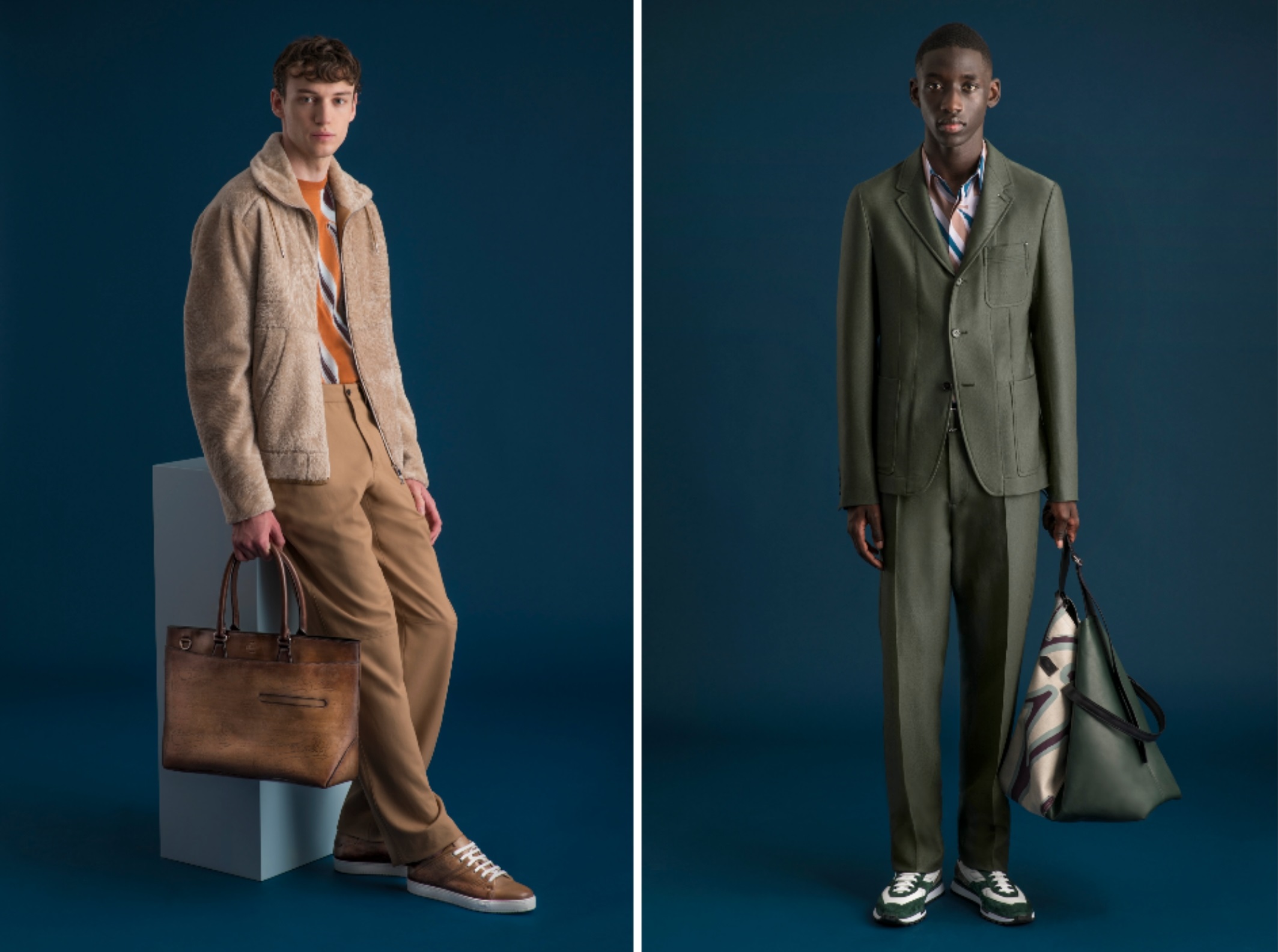 皮具方面,Un jour公文包和Toujours手提袋以Patina染色技艺呈现手工扎染效果,有绿色、蓝色和驼色可选,分别被命名为甲壳虫绿、蓝宝石蓝与多瑙色。标志性的SIGNATURE徽章图纹在帆布材质上以人字型排布,不同款式包袋的底部、边角和包内标签均采用Venezia皮革收边。Berluti标志性的皮包经过重新设计,棕褐色基调上呈现出颗粒质感,兼具休闲外观与柔软触感。Jour Softy系列共涵盖四款包袋,分别是Late Hour公文包、Late Hour购物袋、Late Hour双肩背包和Late Hour手拿包,Scritto图纹重现于提花帆布之上,与成衣系列相映成趣。