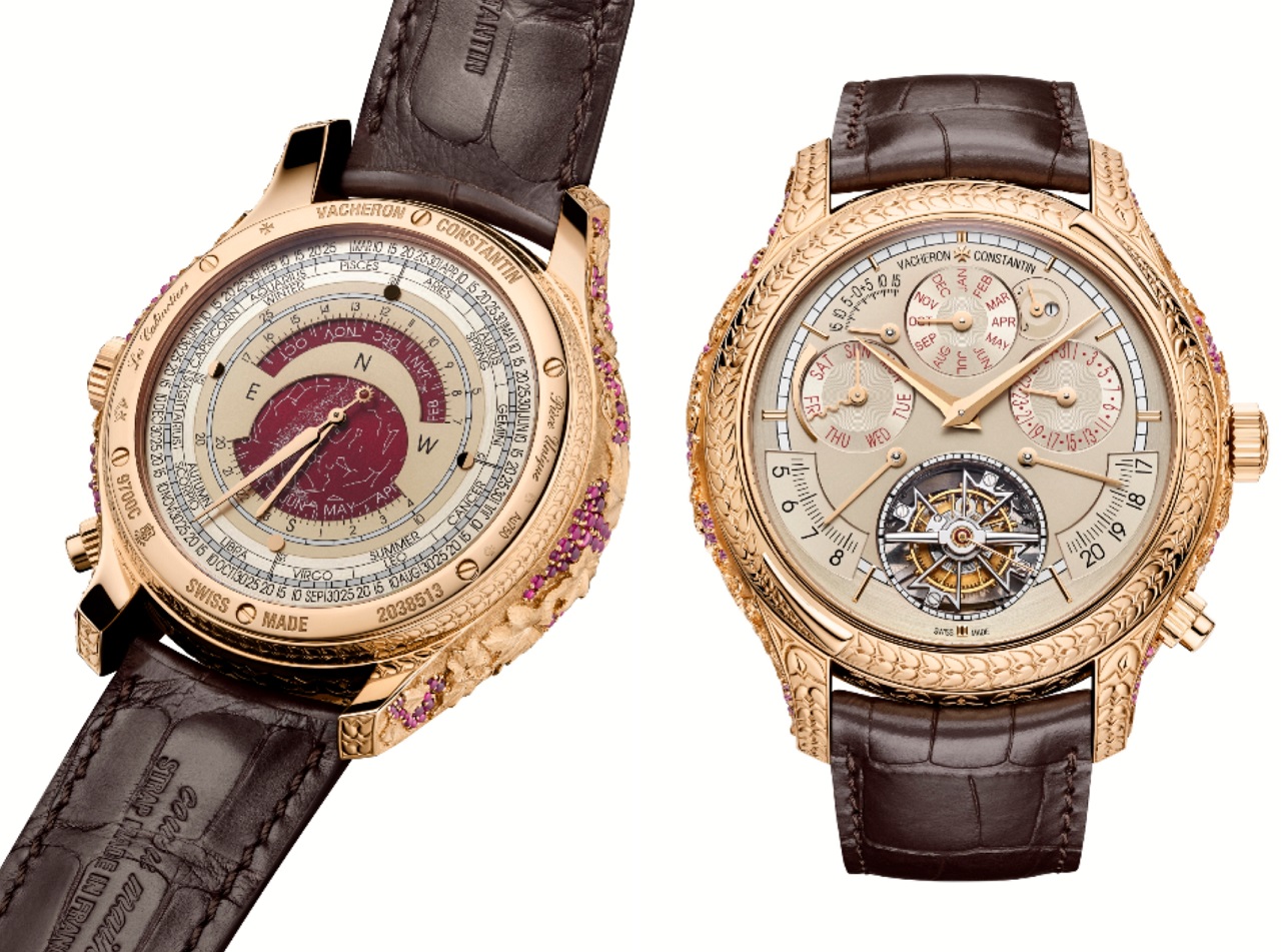 各项历法和天文功能醒目地分布于腕表的正反两面表盘上。正面表盘的6点位可一览陀飞轮美妙的机械之舞。表盘上半部分以三个小表盘显示万年历信息,分别指示日期、星期和月份,在2100年之前皆无需调校。1点和2点位之间还设有小巧的闰年显示视窗,旁边为报时装置力矩显示,可显示三问报时功能的动力储存。机芯动力储存显示则由一根与星期指针同轴的蛇形指针指示。