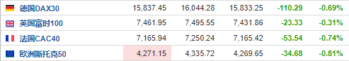 正在交易中的欧洲市场普遍下跌,截至发稿,德国DAX30指数跌0.69%,英国富时100指数跌0.31%,法国CAC40指数跌0.74%。