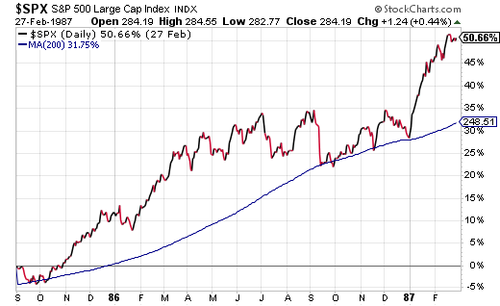 显然,1986年时的200日均线失守并没有唤醒“冬眠的熊”。下图显示了多头在当时如何沿着200日均线反弹,然后再次起飞。