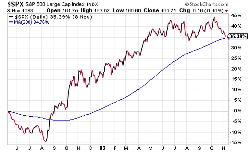 20世纪80年代初的经历是多头最终赢得长期拉锯战的一个绝佳案例。下图显示了美股在1982年触底后一路上涨,直至1983年跌穿200日均线时的牛市情况。