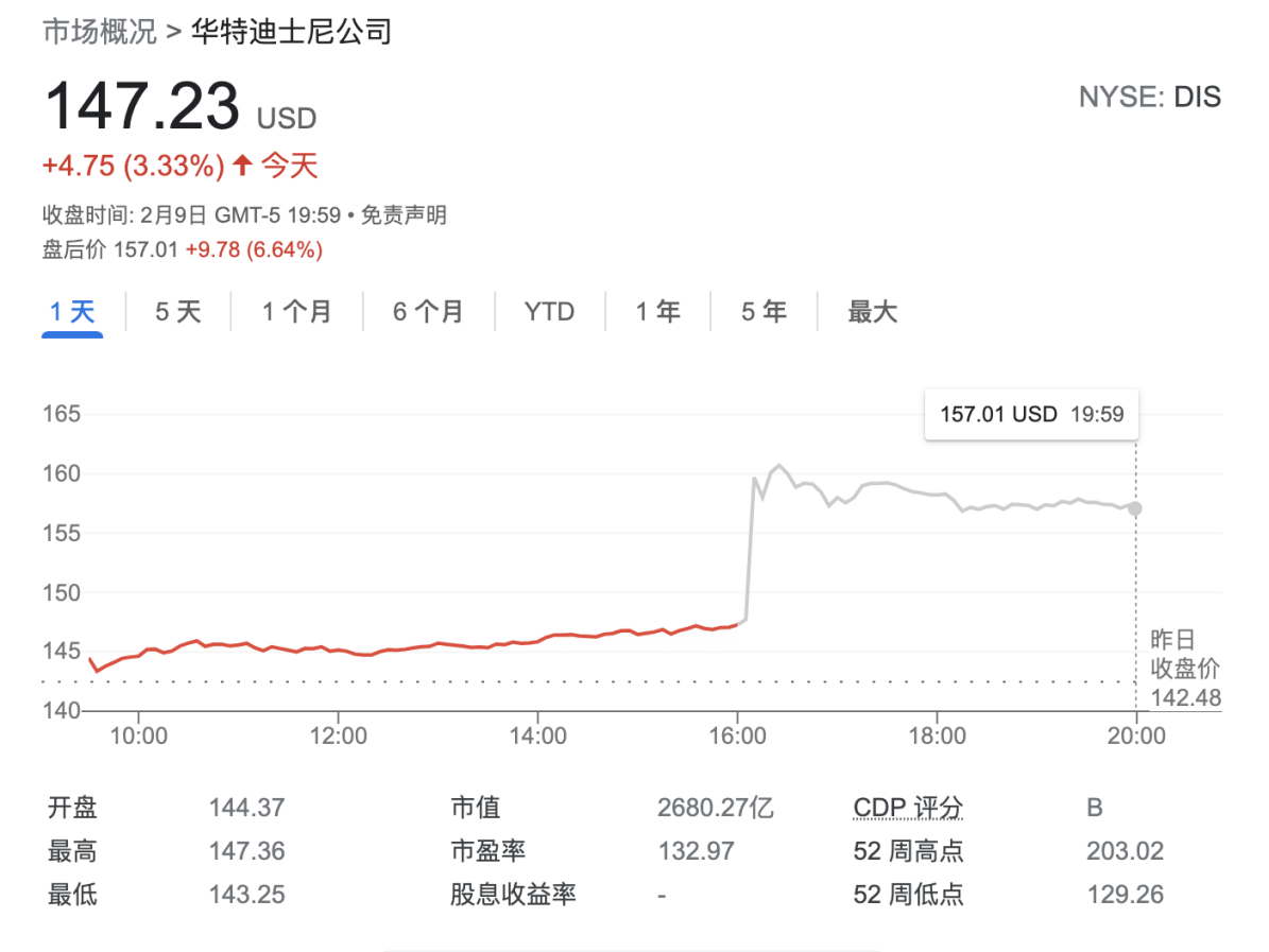 财报公布后,迪士尼股价周三盘后一度大涨8%。该股在常规交易时段收涨3.33%,报147.23美元。不过,年初至今,该股累计跌幅超6%。