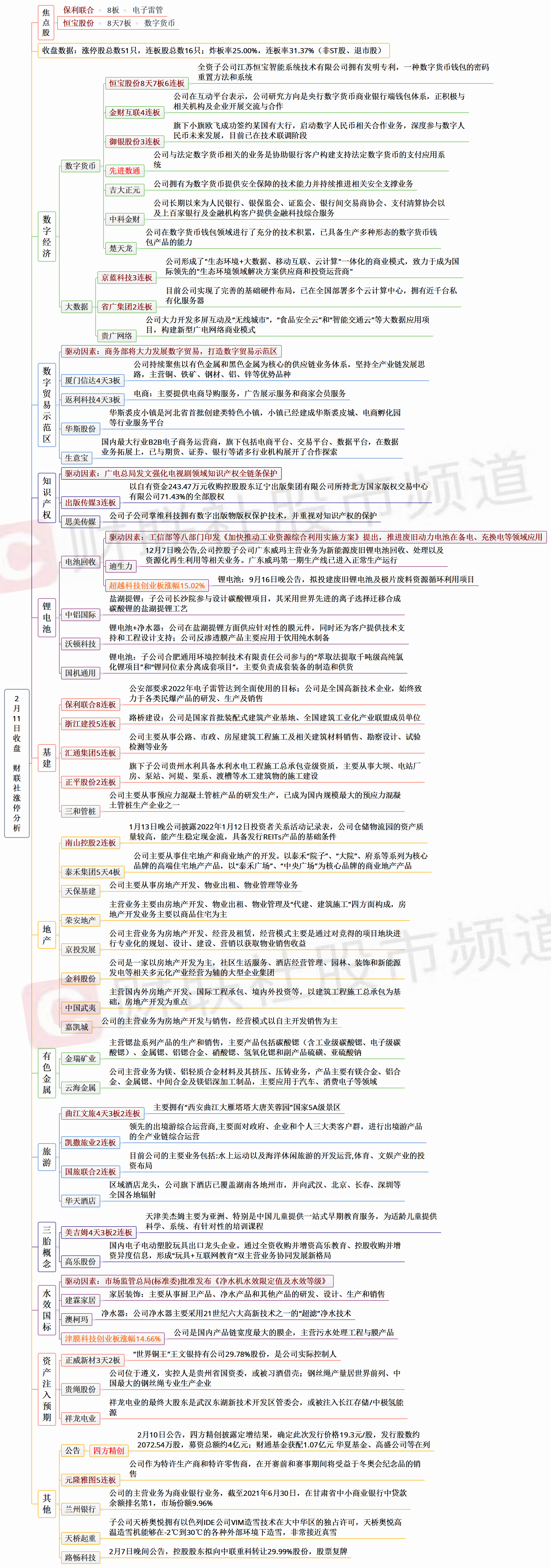 【2月11日涨停分析】今日共51股涨停,连板股总数16只,17股封板未遂,封板率为75%(不含ST股、退市股及未开板新股)。个股方面,电子雷管概念股保利联合8板,数字货币板块恒宝股份8天7板、金财互联4板,基建股浙江建投5板、汇通集团5板,冬奥会概念股元隆雅图5板,地产股泰禾集团5天4板、南山控股2板,知识产权保护的出版传媒3板,大数据板块京蓝科技3板、省广集团2板,旅游板块曲江文旅4天3板、凯撒旅业2板,三胎概念股美吉姆4天3板,电商股厦门信达4天3板、返利科技4天3板。今日收涨个股597只,收跌个股3964只。