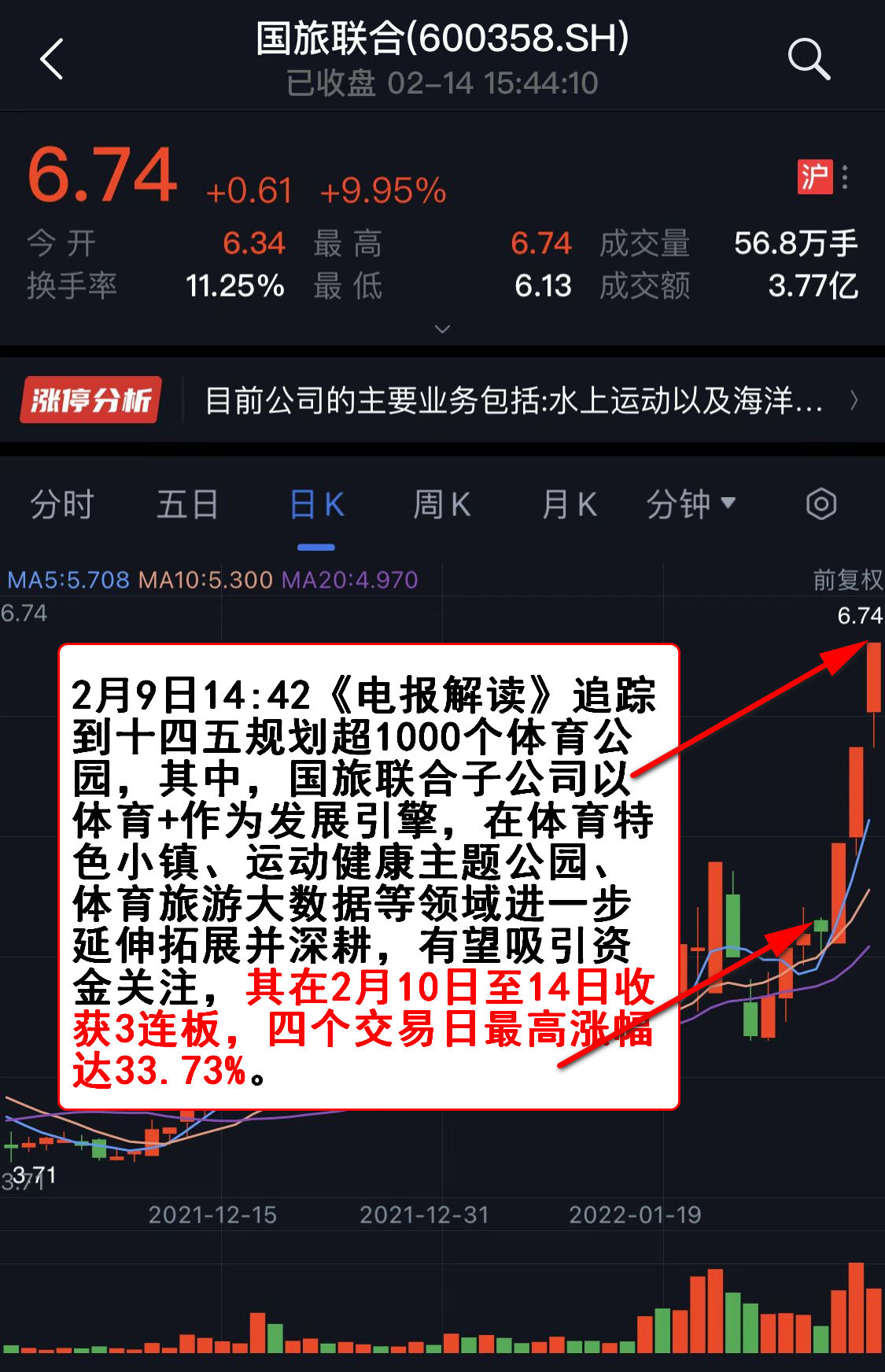 2月9日14:42《电报解读》追踪到十四五规划超1000个体育公园,其中,国旅联合子公司以体育+作为发展引擎,在体育特色小镇、运动健康主题公园、体育旅游大数据等领域进一步延伸拓展并深耕,有望吸引资金关注,其在2月10日至14日收获3连板,四个交易日最高涨幅达33.73%。
