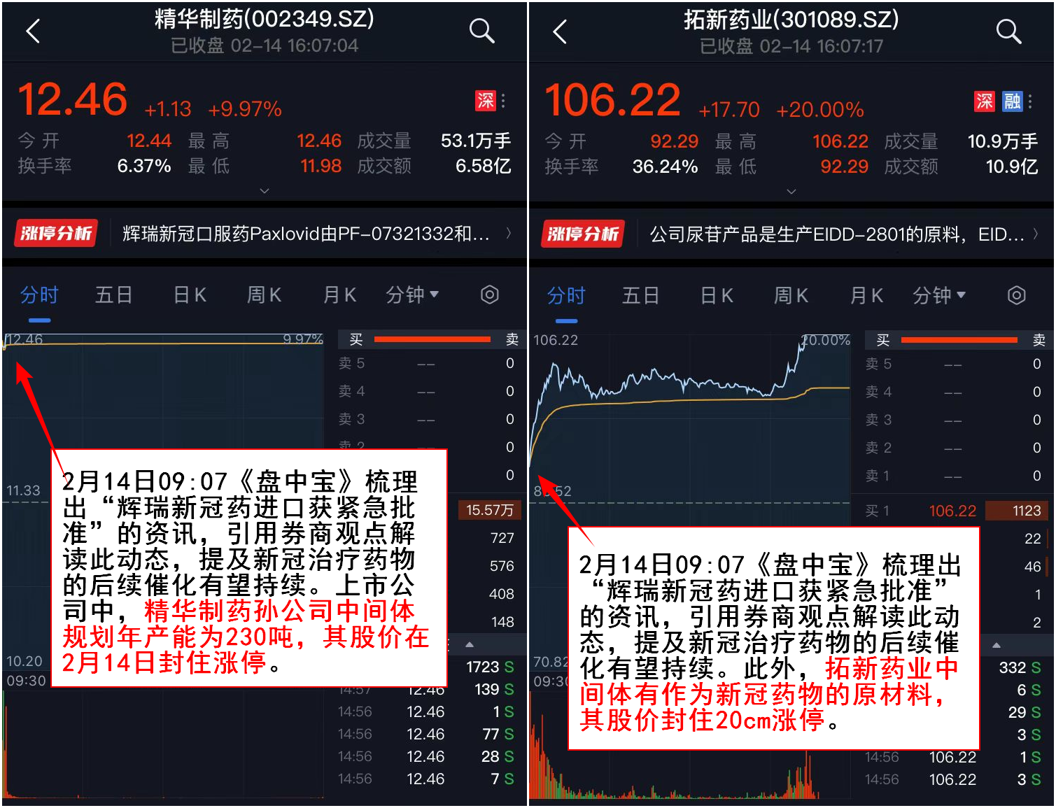 2月14日09:07《盘中宝》梳理出“辉瑞新冠药进口获紧急批准”的资讯,引用券商观点解读此动态,提及新冠治疗药物的后续催化有望持续。上市公司中,精华制药孙公司中间体规划年产能为230吨,其股价在2月14日封住涨停。此外,拓新药业中间体有作为新冠药物的原材料,其股价封住20cm涨停。