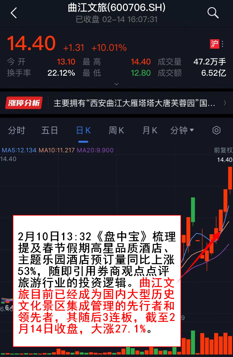 2月10日13:32《盘中宝》梳理提及春节假期高星品质酒店、主题乐园酒店预订量同比上涨53%,随即引用券商观点点评旅游行业的投资逻辑,指出国内游迎来超级“内循环”,疫情控制后“刚性”旅游需求将迎来井喷。上市公司中,曲江文旅目前已经成为国内大型历史文化景区集成管理的先行者和领先者,其3连板截至2月14日收盘,大涨27.1%。