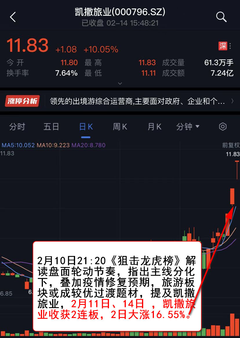 2月10日21:20《狙击龙虎榜》解读盘面轮动节奏,指出主线分化下,叠加疫情修复预期,旅游板块或成较优过渡题材,提及凯撒旅业,2月11日、14日 ,凯撒旅业收获2连板,2日大涨16.55%。