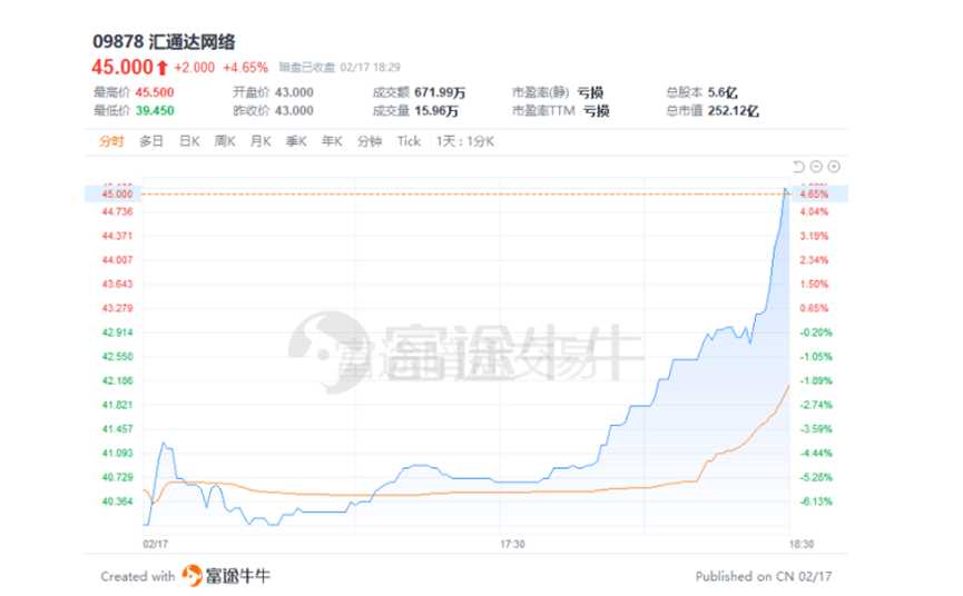 在周四盘后的暗盘中,该公司都有一定程度的上涨,例如在辉立证券的暗盘交易中,其最终报收45.10港元,较招股价43港元高4.88%;在耀才证券和富途证券的暗盘交易中,其均报收45港元,较招股价高4.65%。