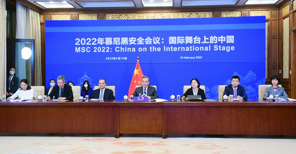 据中国外交部官网消息,2022年2月19日晚,国务委员兼外长王毅在北京应邀以视频方式出席第58届慕尼黑安全会议中国专场并发表主旨讲话。