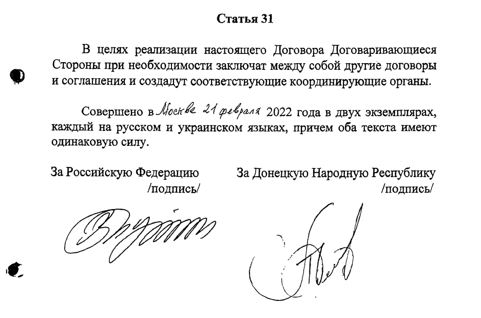 财联社(上海,编辑 史正丞)讯,在俄罗斯周一宣布承认“顿涅茨克共和国”和“卢甘斯克共和国”后,普京代表俄罗斯政府分别与两个地区的自治政府签订了友好合作互助条约,其中的具体条款明确展示了俄罗斯在该地区即将采取的进一步动作。