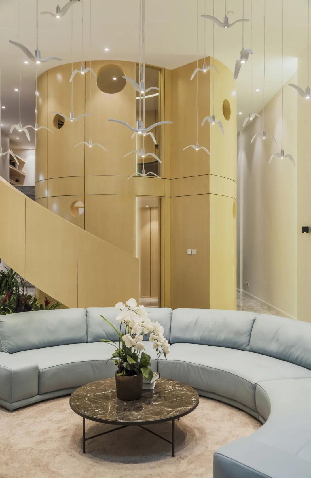 树干外部飞着成群的白色小鸟,是地下室圆桶结构的外部光源。“希望小孩未来像鸟儿一样,展翅飞翔。”
