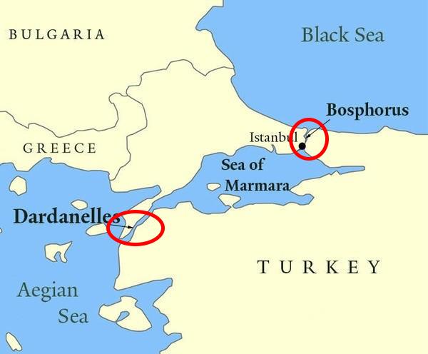 博斯普鲁斯海峡是沟通黑海和马尔马拉海的一条狭窄水道,达达尼尔海峡则位于小亚细亚半岛与巴尔干半岛之间,是亚洲与欧洲分界处的海峡。《蒙特勒公约》签署于1936年,旨在通过在博斯普鲁斯海峡和达达尼尔海峡设定严格的商业和海军方面的规定以让黑海“去军事化”。