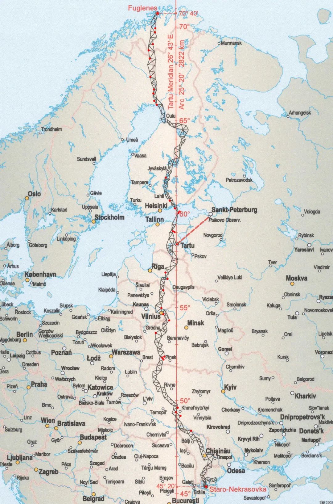 斯特鲁维测地弧是从挪威北部的哈默菲斯特,一直到乌克兰伊兹梅尔的一组三角测量点,穿越10个国家,总距离为2820公里。这组测量点是由德国出生的俄罗斯天文学家瓦西里·雅科夫列维奇·斯特鲁维于1816年到1855年期间进行测量的测量点,代表着人类首次对子午线长短的精确测量。这一测量帮助人类掌握了地球的确切大小和形状,是地球科学和地形绘图学发展中的重要一步。
