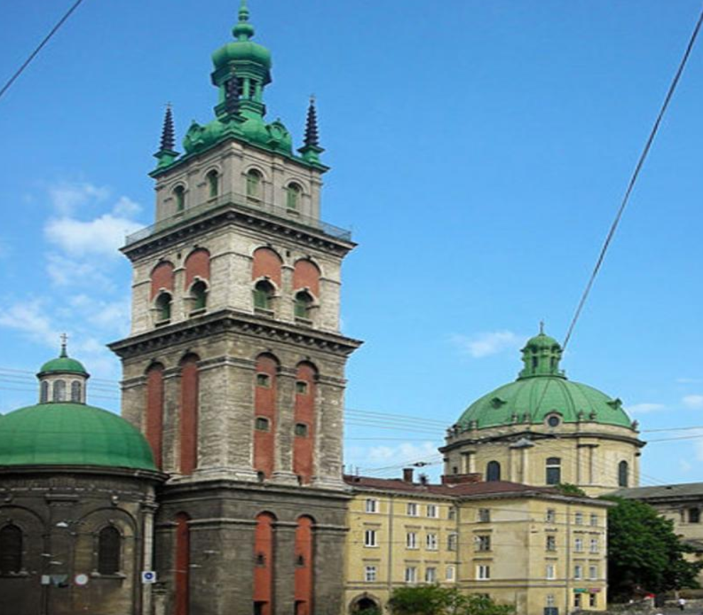 南面的东正教圣母升天大教堂始建于1344年,教堂为半圆形屋顶,与常见的东正教洋葱型屋顶大相径庭,绿色的钟楼高达65米,为利沃夫标志性建筑。