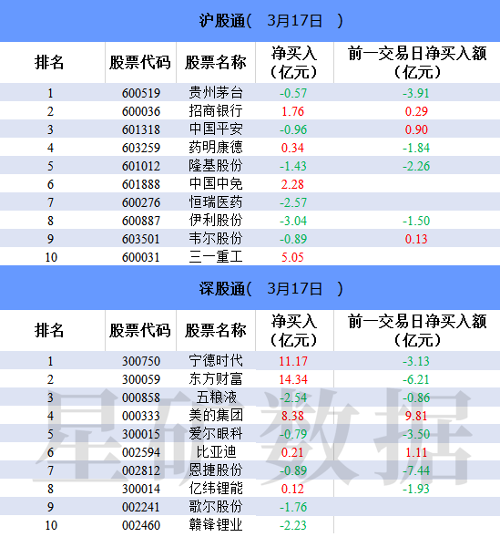 【北向资金今日大幅净买入53亿元 东方财富获净买入14亿元】财联社3月17日电,北向资金今日大幅净买入53.65亿元。东方财富、宁德时代、美的集团分别获净买入14.34亿元、11.17亿元、8.38亿元。伊利股份净卖出额居首,金额为3.04亿元。