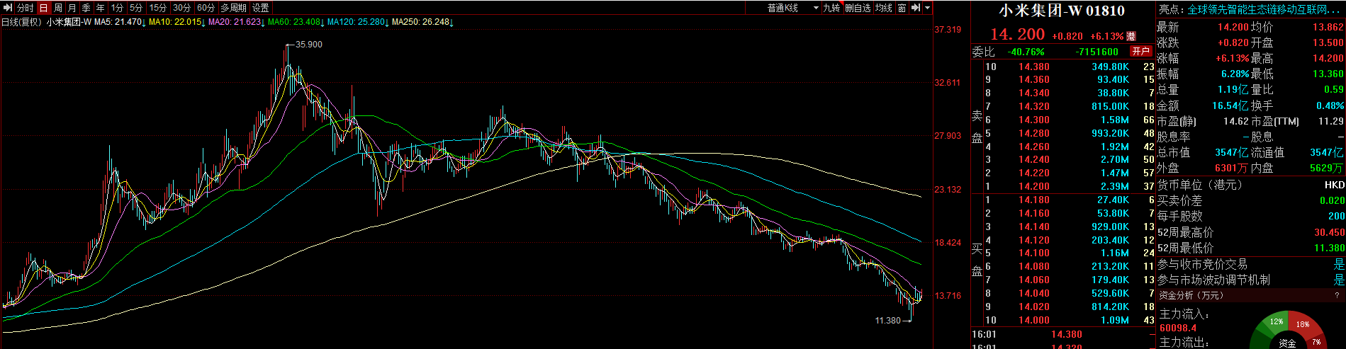 最近一年,小米集团股价经历了大幅调整,从最高点至今,股价已跌去了近三分之二。截至今日收盘,小米集团股价报收14.20港元/股,动态市盈率为11.29倍。