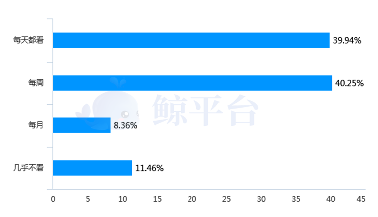 小鲸也不知道00后熬夜时在干啥,毕竟零点以后还在刷新闻的只有4%。大多数00后会选择在17点-21点之间看新闻,该比例达到54%;其次,选择中午11点-14点之间看新闻的也较多,比例达到41%。在刷新闻的频率上,80%的00后至少每周都要看新闻。