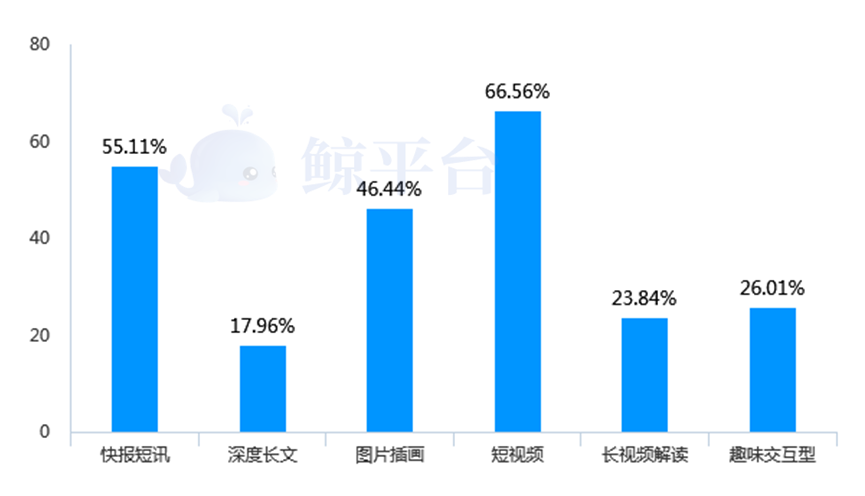 在“00后喜欢的新闻形式”调查中,有67%选择了“短视频”形式。其次是快报短讯,占比55%。